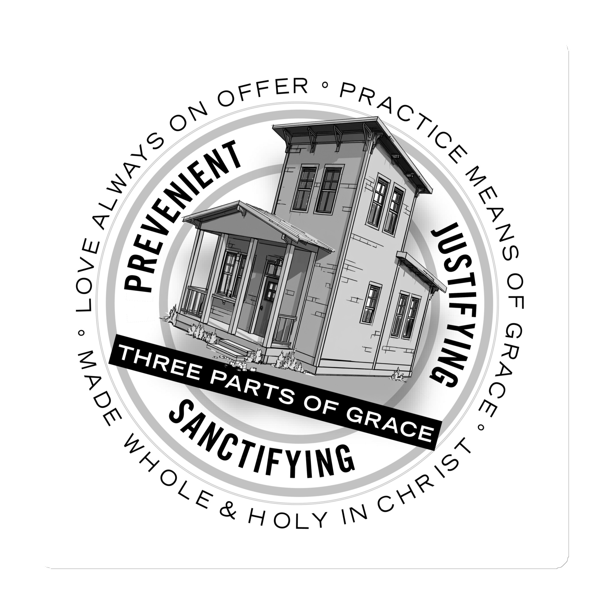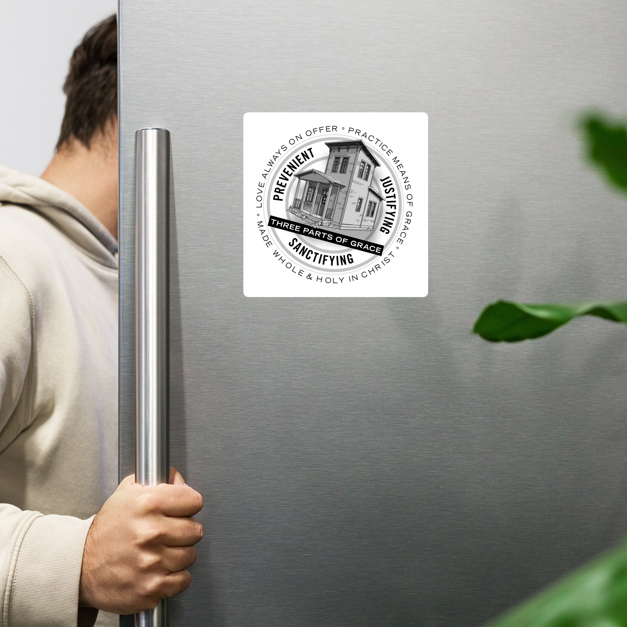 Every Methodist Church fridge needs this magnet! What better way to initiate discussions about the three parts of grace and John Wesley’s metaphor of the house than to have people constantly asking what this big 6″x6″ magnet is all about?